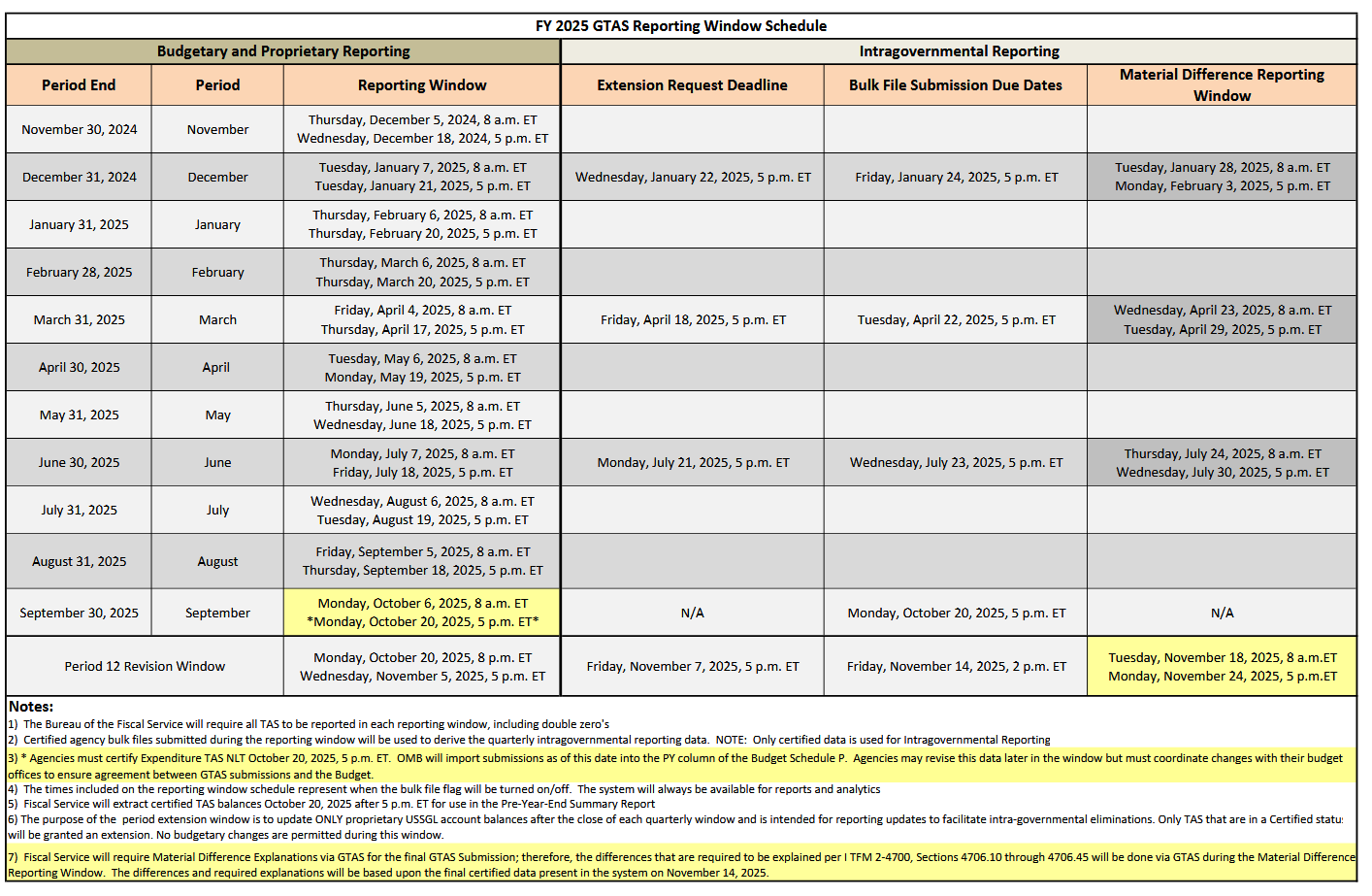 This schedule is published annually by Treasury, and you can find it in GTAS. The reporting windows show you exactly when submissions open, when they're due, and when Treasury closes the window for each period.